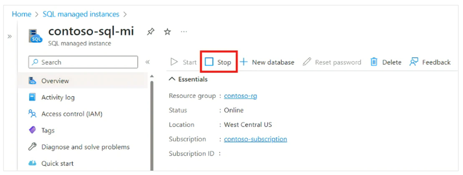 Stope and start in instance Stop and start an instance (preview) - Azure SQL Managed Instance | Microsoft Learn