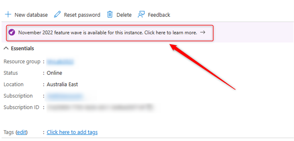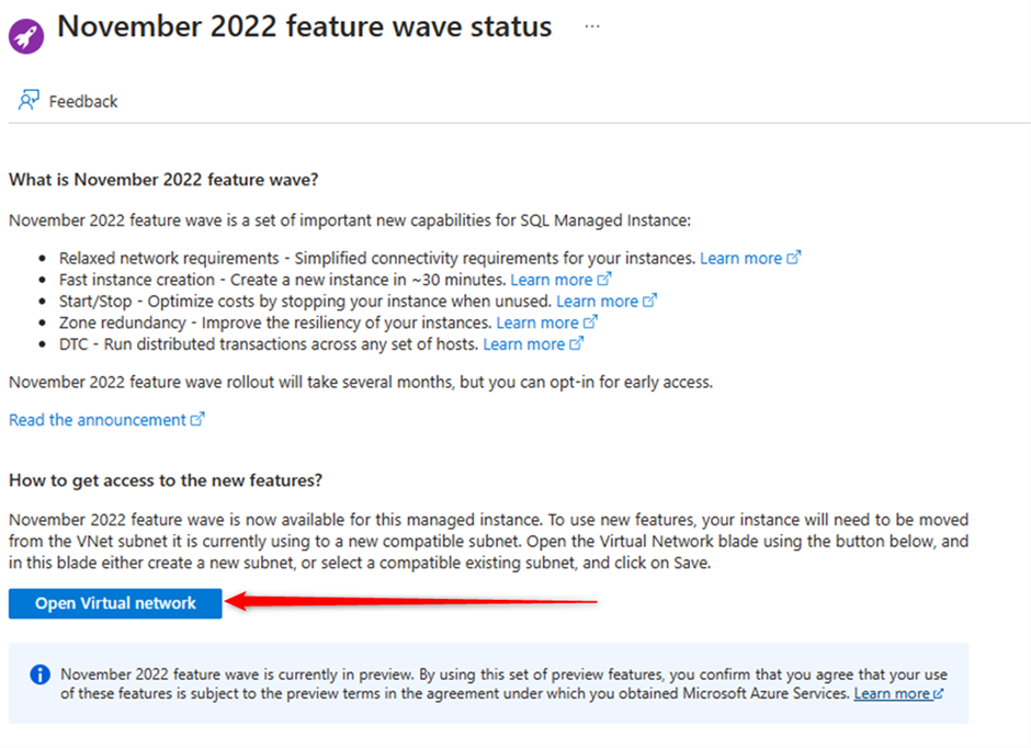 Another point is for using new features, your instance will need to be moved from the VNet subnet it is currently using to a new compatible subnet, you may notice about the below message on your manage instance page in Portal, if you want click on the message and see how you can enrol for this feature.