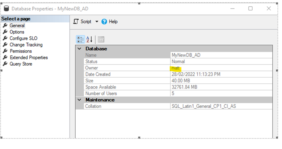 ALTER AUTHORIZATION ON DATABASE::[MyNewDB_AD] to [matt];