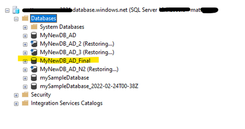 After this error message, I could not see that database in Azure portal however the database was in restoring state when I checked with SSMS, that’s so strange! Not any more details in logs or anywhere else!