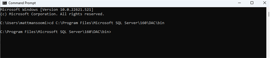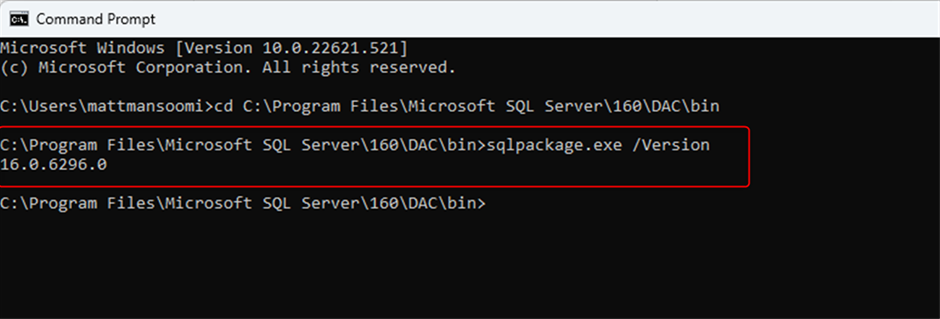 After installing SQLPackage go to the installed folder C:\Program Files\Microsoft SQL Server\160\DAC\bin, You need to run CMD from this location.