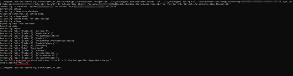 SqlPackage /Action:Export /TargetFile:"C:\SQLPackageFiles\ExportHere.bacpac" /df:"C:\SQLPackageFiles\log.txt" /SourceConnectionString:"Server=tcp:xxx.database.windows.net,1433;Initial Catalog=YourDatabaseNameHere;Persist Security Info=False;User ID=YourUserName;Password=YourPassword;MultipleActiveResultSets=False;Encrypt=True;TrustServerCertificate=False;Connection Timeout=30;"