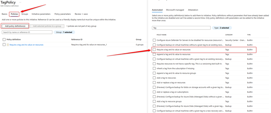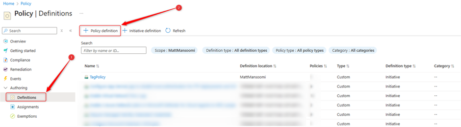 3-In the first place you can create the definitions with details like location, name. as you see I have created ‘TagPolicy’, from the second tab ‘Policy’ you can choose many built-in policies, for this example I want to force the user to have two tags once they’re trying to create new resource.
