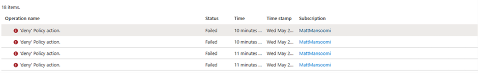 I did not have a chance to work on Custom Policy in Azure, Thanks one of the clients that came to me with error message that they could not deploy / modify one their database. From the Activity logs we observed the error message like ‘Policies attempted to append some fields which already exist in the request with different values.’ So, in this scenario they checked their Policy in subscription level and after putting the right value they could deploy the new resource in their environment.